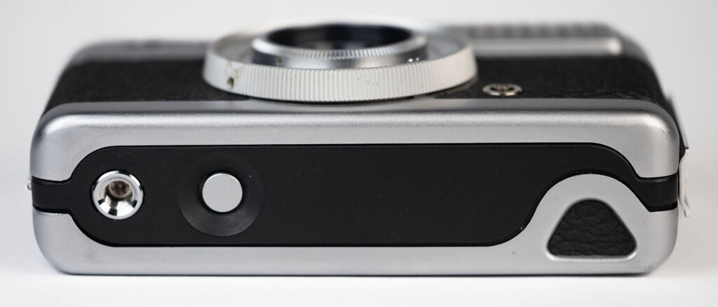 The brilliant Keplerian viewfinder is located just above the lens, close enough that parallax correction would be very minor at the closest distances. It offers no information except framing. It is remarkably bright and crisp, despite its diminutive size. The viewfinder alone contains four lens elements and three prisms. That alone tells me something about the intent of the designers.